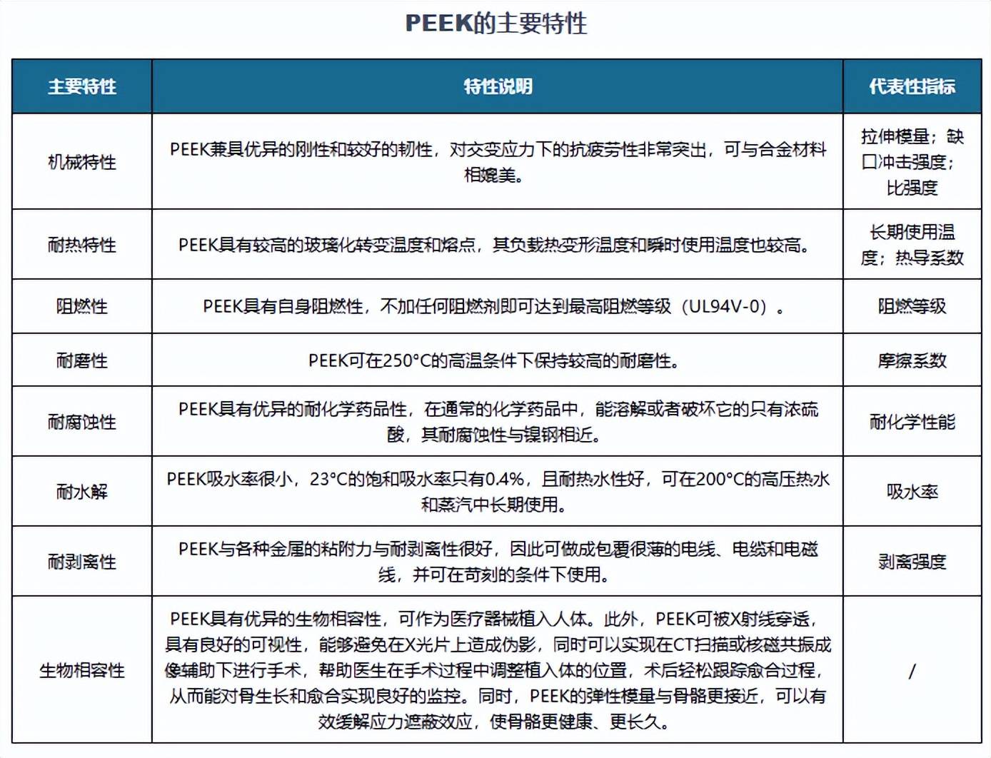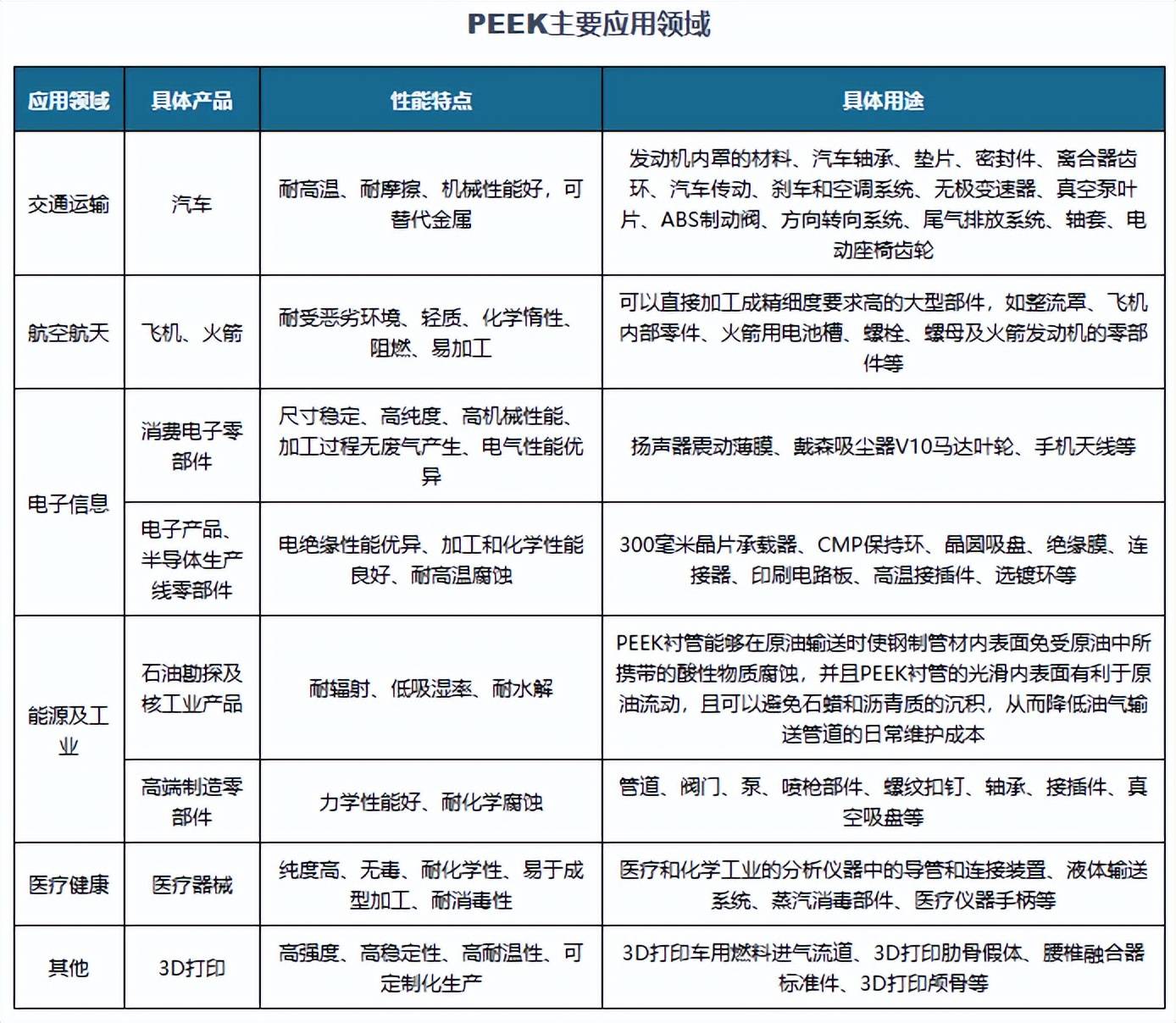 由于PEEK材料具有耐热性、耐磨性、耐疲劳性、耐辐照性、耐剥离性、抗蠕变性、尺寸稳定性、耐冲击性、耐化学药品性、无毒、阻燃等优异的综合性能,而且两个醚键和羰基又为材料提供了柔韧性与优良的工艺性。因此,PEEK在电子电气、航空航天、汽车、能源及其他工业、医疗等多个领域得到广泛应用。