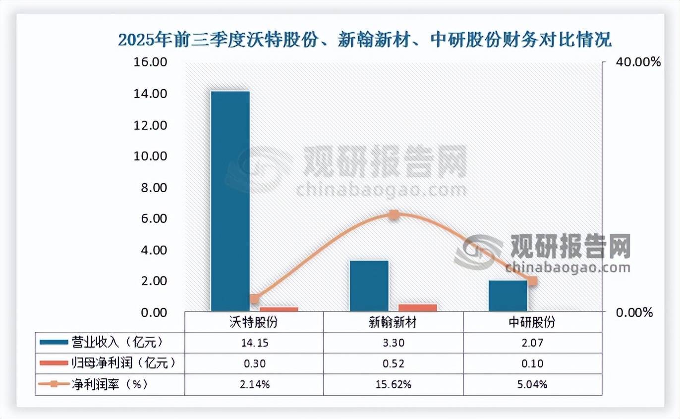 从财务对比来看,2025年前三季度沃特股份的收入规模最高但盈利能力较低,实现归母净利润0.3亿,净利润率仅2.14%,而中研股份和新瀚新材的净利润率分别为5.04%和15.62%。